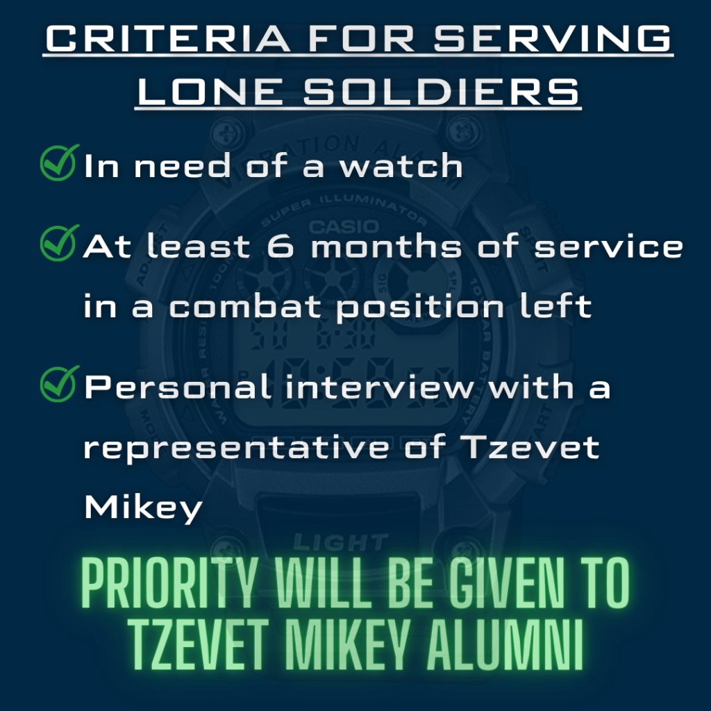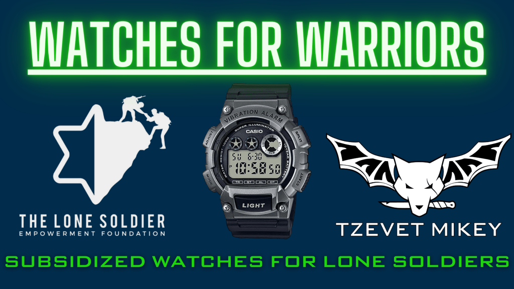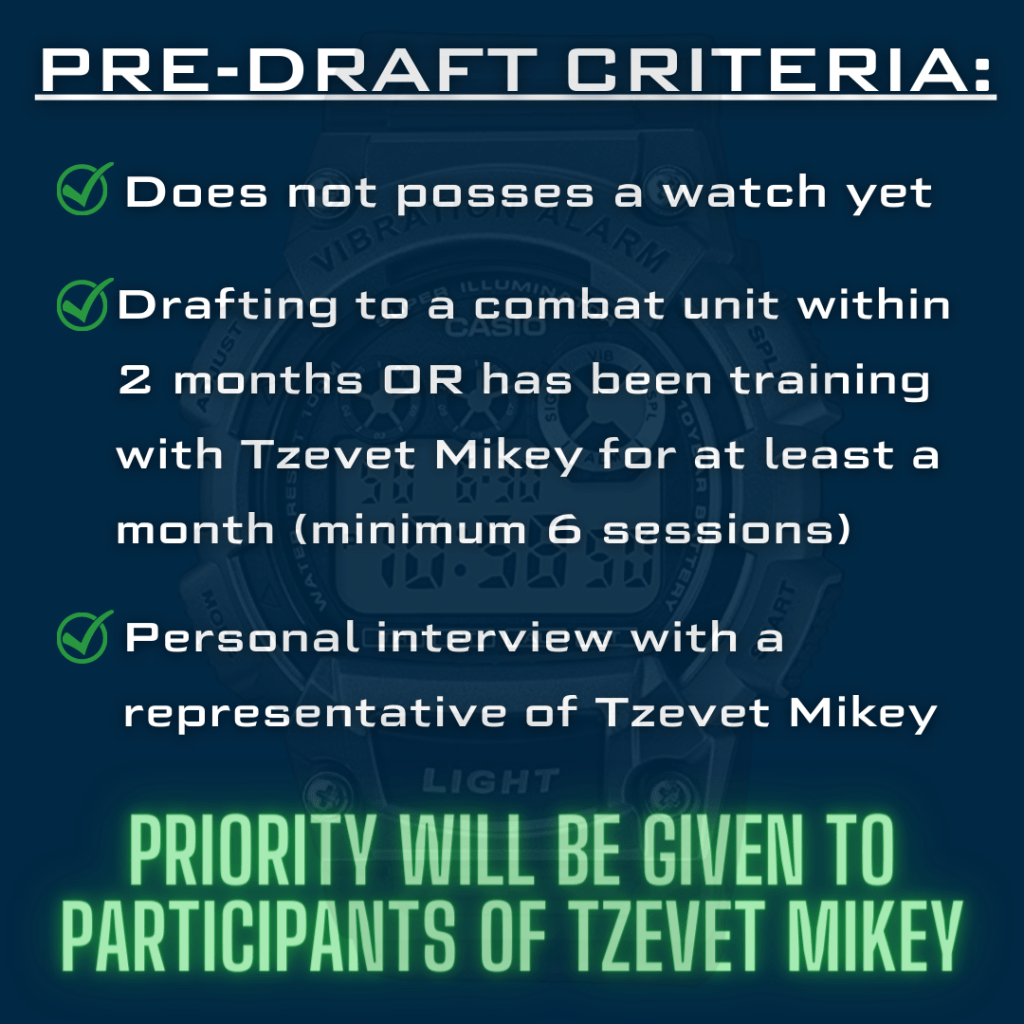 Through the Watches For Warrios program, Tzevet Mikey is providing a limited amount of subsidized watches (50₪) to drafting and serving combat soldiers.